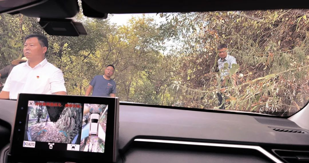 ▲由于探訪的路崎嶇、窄小,車(chē)輛需要多人指引調(diào)整前行