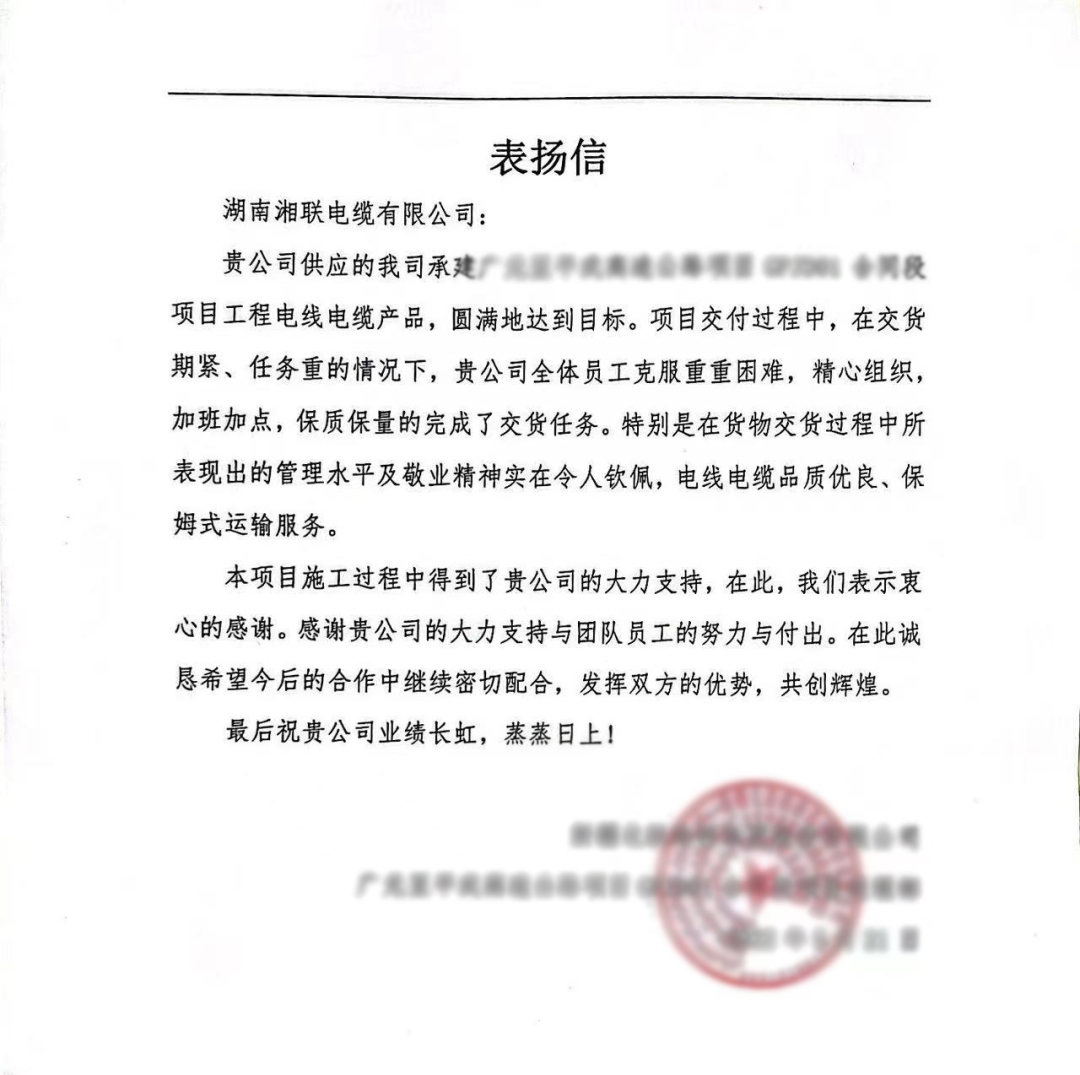 2022年4月18日,湖南省守合同重信用企業(yè)協(xié)會對“2021年度湖南省守合同重信用企業(yè)”進(jìn)行公示,湘聯(lián)電纜再次上榜。